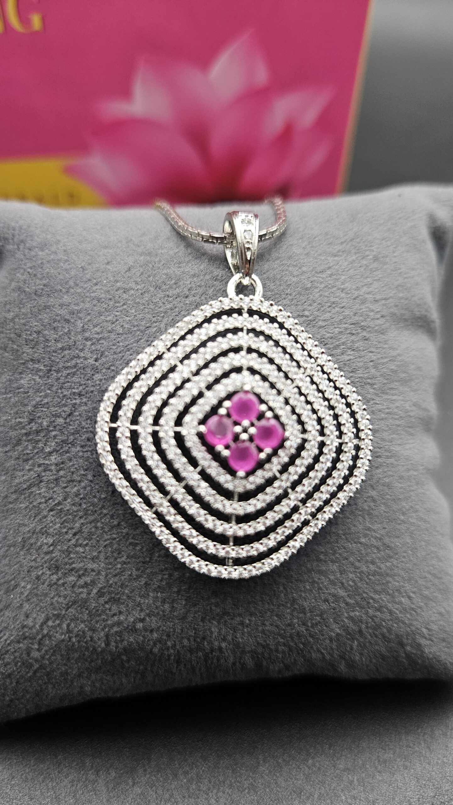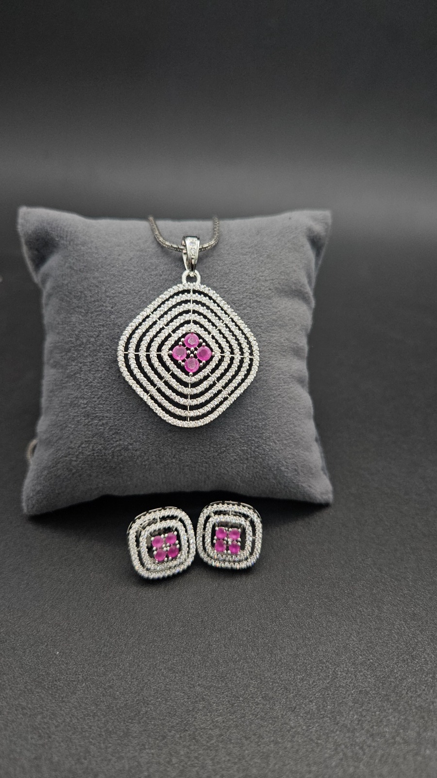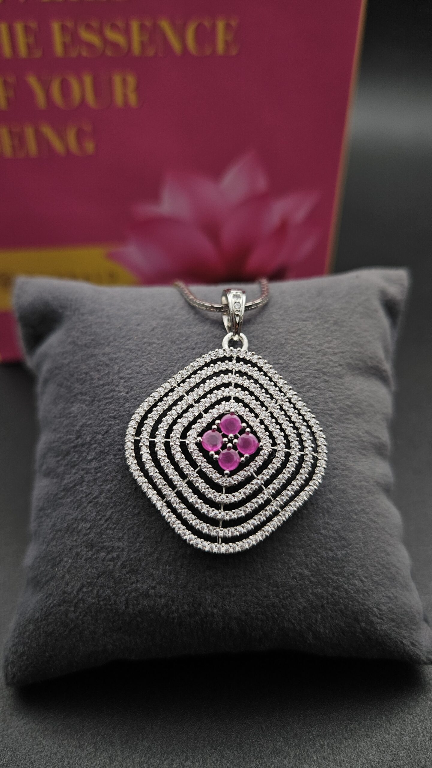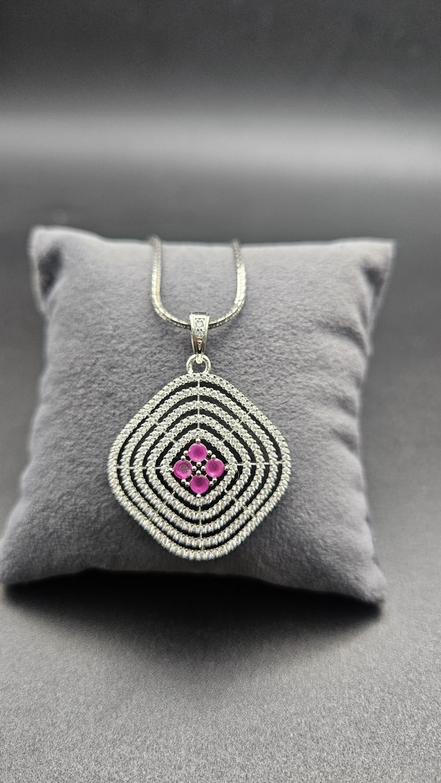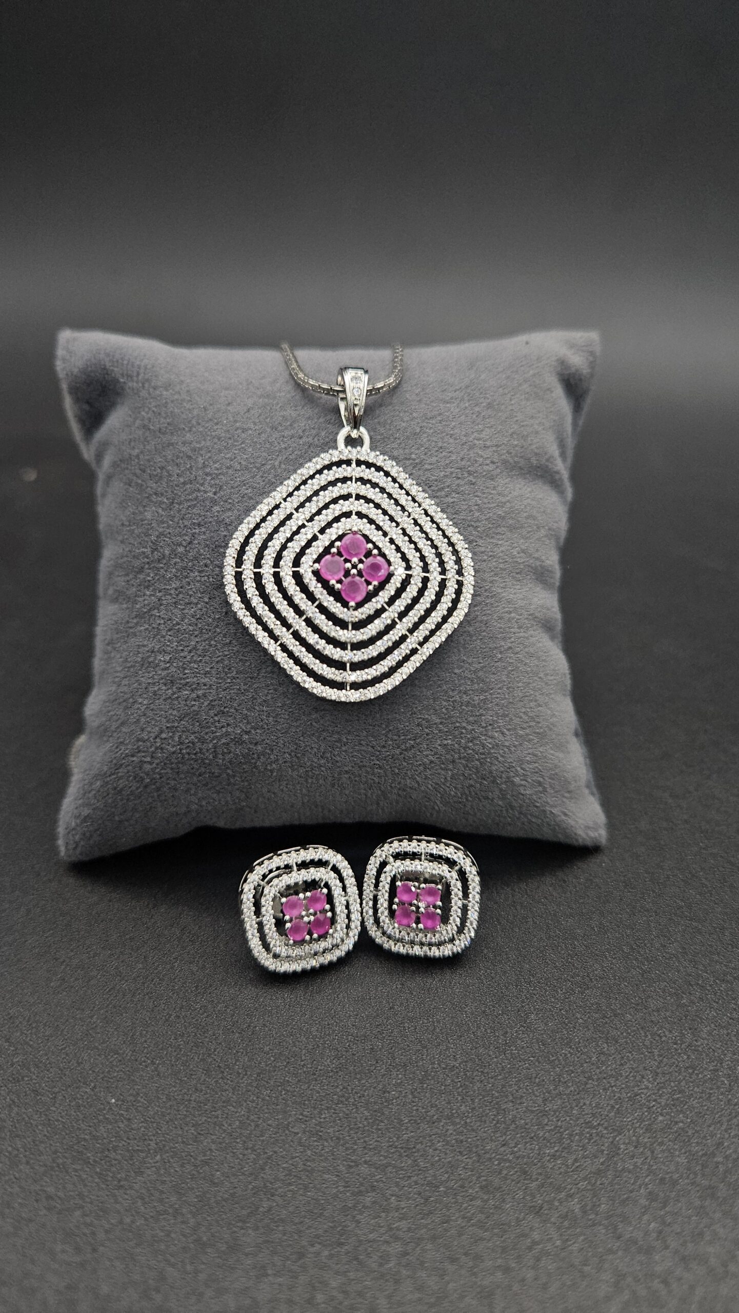 The Sterling Silver Pink Stone Pendant Set is a perfect harmony of structured geometry and delicate floral beauty. Designed with concentric geometric layers surrounding a vibrant pink stone cluster, this jewellery set offers a bold yet elegant visual appeal.