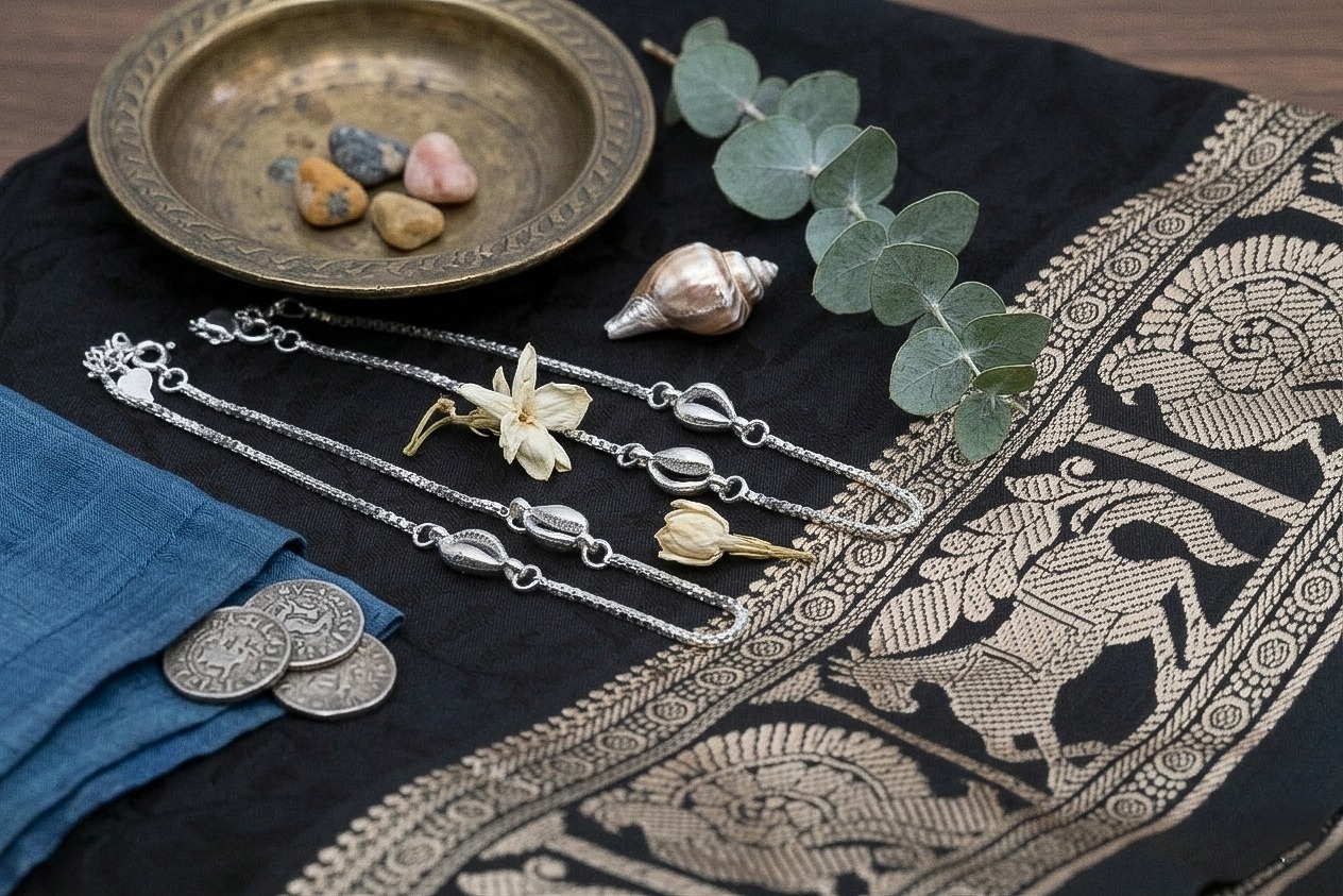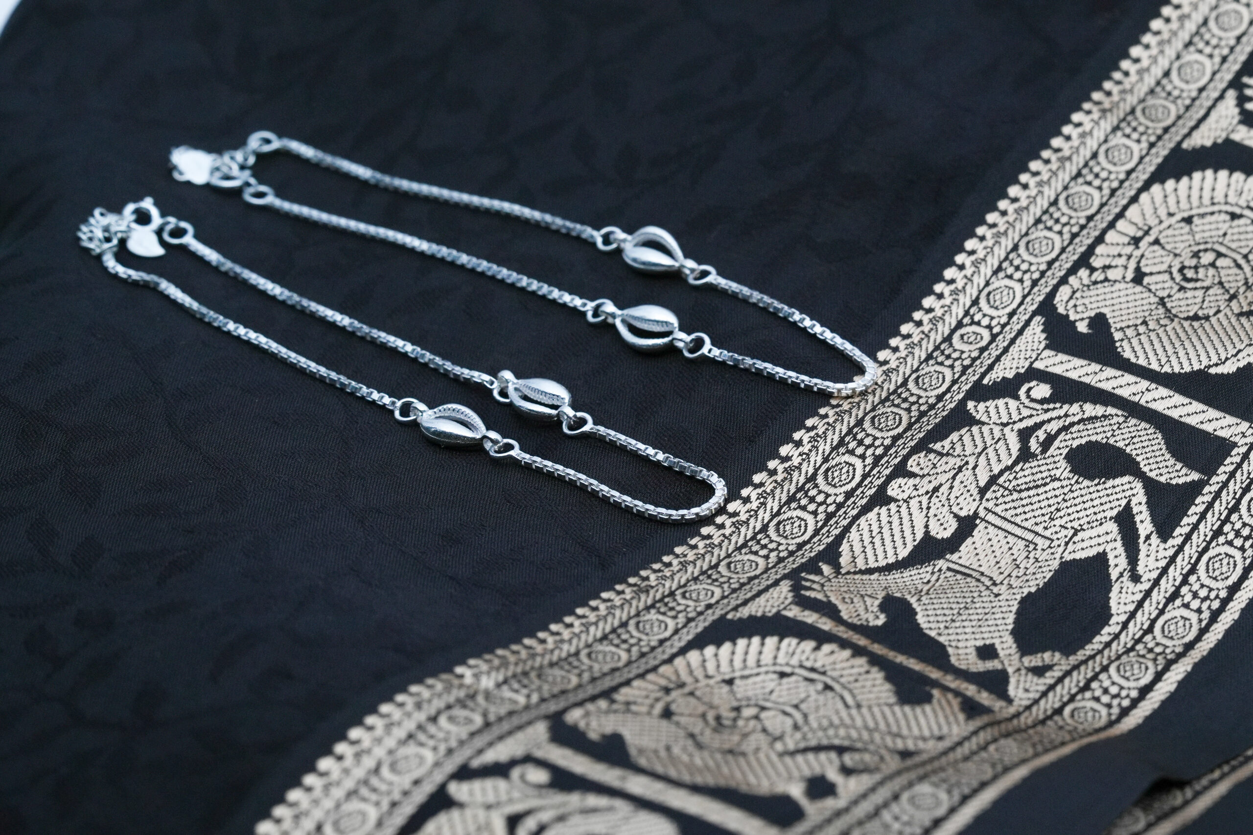 The Sterling Silver Shell Anklet pair captures the quiet beauty of the sea. Designed with sleek silver chains and delicate shell-shaped charms, these anklets evoke a sense of calm, simplicity, and effortless style.